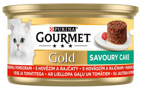 GOURMET Gold Savoury Cake predstavuje jemne pokrájané kúsky s hovädzím, kuraťom, jahňacím, alebo inými vycibrenými variantmi, starostlivo ochutené len štipkou omáčky.